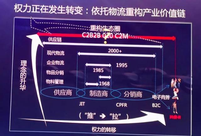 所以,我们可以看到权利在转移,最早物流提出革命性思想都是在制造业里面。我做咨询的时候,我最先服务的客户是海尔、美的、大众,后来变成了苏宁、国美等渠道商,再然后是电商,比如阿里巴巴、京东等。无论你怎么称呼它们,叫它们C2B2B,S2B2C、M2C、C2M、B2B。这背后是权利的转移,价值链或生态链的重构。而物流在其中扮演了非常重要的角色。