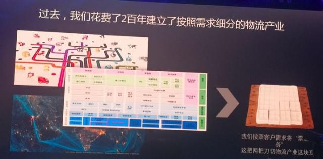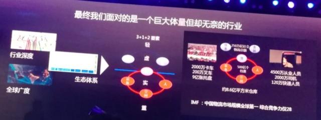 你可以看到有250万亿的社会物流总额,有500亿个包裹、4500万从业人员、2000万台卡车、9亿平方米的仓库。现在,它们都变了,就是用基础在横切,豆腐块也是横切了,切成了场景、基础设施。