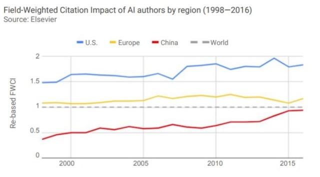 爱思唯尔的研究报告显示,中国AI研究论文存在引用率不高的情况。2017年中国AI论文的引用率刚刚与全球平均水平持平。