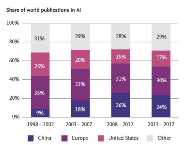 在2017年,中国在人工智能领域(AI)的研究成果数量仍旧保持全球第二的势头(按国别为全球第一),并有望在四年内赶超欧洲,成为全球人工智能研究成果最多的经济体。