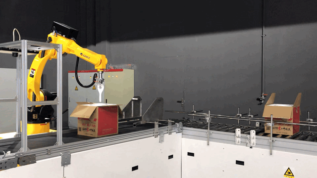 守候在包装线末尾的8号机器人“大哥”按时将迎面过来的“小苹果”轻轻送进仓库。