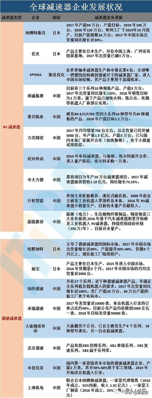 精密减速器的存在使伺服电机在一个合适的速度下运转,并精确地将转速降到机器人各部位需要的速度,提高机械体刚性的同时输出更大的力矩。与通用减速器相比,机器人关节减速器要求具有传动链短、体积小、功率大、质量轻和易于控制等特点。