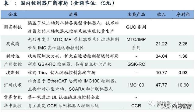 竞争格局:硬件差距较小,难点集中于软件。控制器本质上就是一个数据处理器,随着半导体技术的成熟,半导体芯片的性价比越来越高,因此控制器在硬件上并无太高门槛。在机器人的核心零部件中,控制器的技术难度是最低的,国内企业开发的控制器产品已经可以满足大部分功能要求。但控制器的核心在于算法要与机器人本体相匹配。目前,国外主流机器人厂商的控制器均是基于运动控制平台进行自主研发,以保证匹配性,导致国内企业控制器尚未形成竞争优势。可以说,国产控制机在硬件上与国外差距不大,差距主要是算法和兼容性方面。