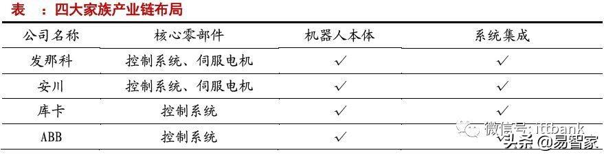 四大家族在工业机器人行业从上游零部件、中游本体到下游系统集成均有布局。像KUKA机器人业务分为本体和系统集成两大块,发那科通过外延并购布局系统集成业务。工业机器人是载体,具体行业应用是焦点,两者兼具的话,本体和系统集成形成联动,渠道相互促进,有望提升产品在行业的影响力,分到更大的市场份额。