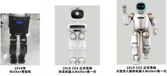 2017年,经过三版迭代, Walker第一代样机确定下来,身高1.35m,重37kg,双腿12个自由度,头部两个自由度,拥有屏幕、语音、灯光等交互元素,还加入了多种传感器,使机器人具备定位导航、机器视觉等自主功能。Walker第一代实现了上下楼梯、全向行走,具备踢球、跳舞等多种互动运动能力,并在2018年1月 CES上精彩亮相。