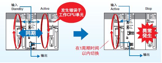 CPU单元内的程序或内部数据在活动/备用CPU之间完全进行自动传送并进行同步。无需选择要同步的数据或单独进行传送。因此在工作CPU单元发生错误时,控制会立即切换给备用CPU。(1周期时间以内)