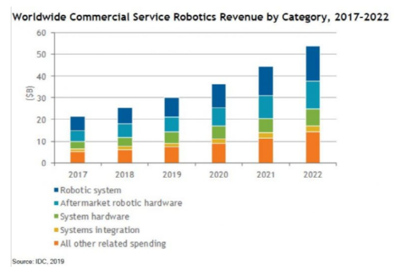 市场调查机关IDC预测截止到2022年世界商用机器人市场将以每年20%的增长率增加,将突破530亿美元。