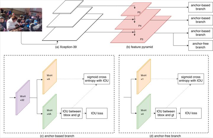 具体而言,SFace 设计了Anchor-based 和 Anchor-free 两个分支,前者基于RetinaNet,后者基于 UnitBox;两个分支都在训练第一步通过 Regression Subnet 生成边界框;接着计算边界框和 groundtruth 边界框之间的 IoU;(Anchor-based 分支的)锚点和(Anchor-free 分支的)像素中 IoU≥0.5 的结果将视为Classfication Subnet 的正样本,其它则视为负样本,Classfication Loss 采用 Focal Loss。我们还尝试过直接回归 IoU,然而实验结果表明,相较于采用 Sigmoid Cross Entropy 或 Focal Loss,直接回归 IoU 所得结果方差较大,实际效果欠佳。