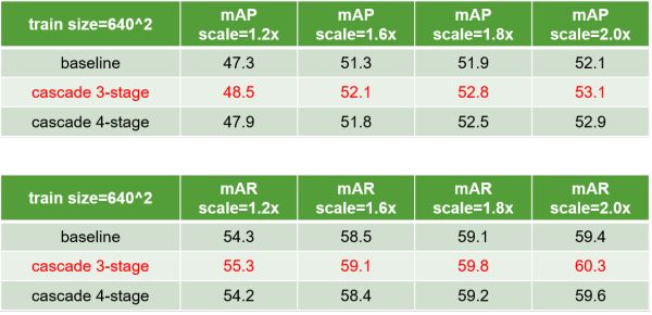 这个 Cascade 方案不难想到,也简单易行,但是的确涨点,Inference 时也只需保留最后一个 Stage,不会增加 Inference 成本;这个方案也有自己的问题,最大的是每个Stage 在共用同一个 Feature Map,对此已有相关论文提出改进。