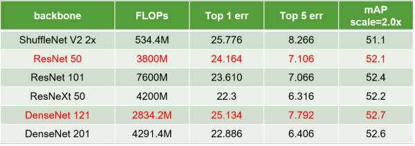 旷视夺冠的方法仍然基于 RetinaNet。通过对比常见 Backbone,我们给出了以下表格的结果。可以发现,更强的 Backbone 并不意味着更好的 Detection能力。一些 Backbone 分类能力更强,但是提供的 Feature 或者分层 Feature并不够好;感受野等对 Detection 至关重要的因素也不合适;对于二分类问题而言也存在过拟合现象。由于实验周期等原因,我们最后简单选择了 ResNet 50 和 DenseNet 121 继续后面的实验。需要声明的是,它们在很多情况下都不是最优 Backbone,我们有必要思考何种Backbone 提取的特征最适合做检测。