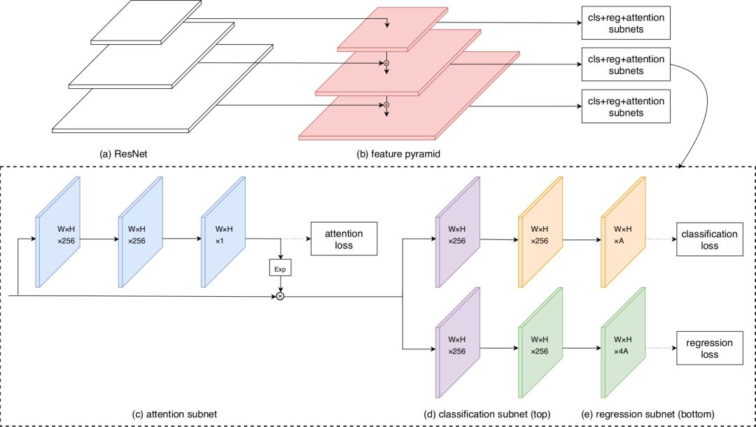 那么,如何设计这个 Spatial-wise Attention。最简单考虑,它应当是一个 Segmentation Mask 或者 Saliency Map。基于 RetinaNet,FAN 选择增加一个Segmentation 分支,对于学到的 Score Map,做一个 exp 把取值范围从 [0, 1] 放缩到[1, e],然后乘以原有的特征图。为简单起见,Segmentation 分支只是叠加 2 个 Conv3x3,Loss 采用 Sigmoid Cross Entropy。
