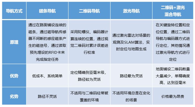 综合来看,目前的AGV导航技术复杂多样,不同的应用场景需选用不同导航技术,例如在有叉车行驶的场合,不宜选用磁条导航;路径需要经常变换的场合应考虑二维码导航或激光导航,而环境经常变换的情况则不宜采用激光导航;场地平整的场景,适宜使用二维码导航;对地面清洁度要求高,精度要求高则选用激光二维码混合导航……