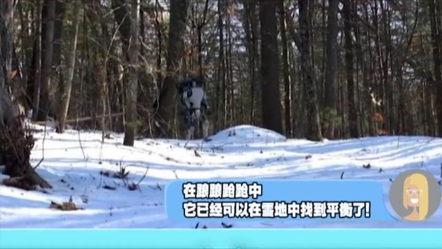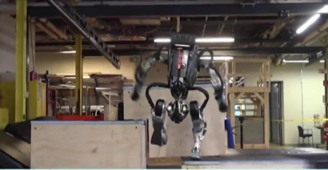我们来仔细看一下这个视频,在视频的开始,Atlsa一抽一抽地小跑来到了一根圆木前,注意,它连停都没停,直接单脚跳过这根圆木,然后用小沈阳式的步伐来到三个错位高台,也是面不改色心不跳地直接单脚跳上去,跳跃高度达40厘米,来从另一个角度看一下。