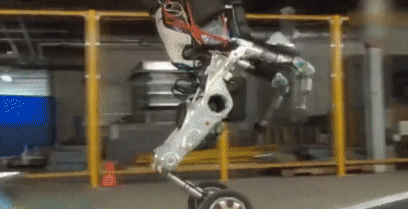 波士顿动力在这些年开发了好多机器人,其中,handle是双足机器人,但是是靠两个轮子来移动,虽然不能后空翻,但是它有属于自己不一样的灵活,可以高速行进中跳过障碍,上坡下坡也没有问题,还有自己的招牌动作,那就是花样滑冰里的旋转。