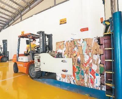 小黄狗公司分拣中心工作人员对废纸进行机械化压缩打包。张楚鑫摄