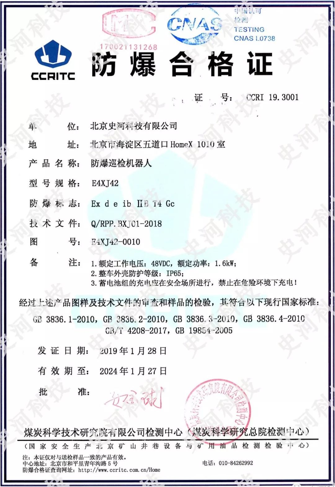 近日,史河科技自主研发的防爆轮式机器人正式获得防爆合格证,该防爆证由煤炭科学研究总院检测中心检测出具。