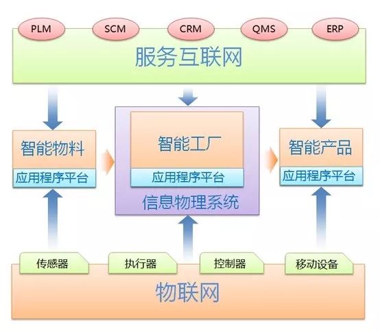 物联网和服务互联网分别位于智能工厂的三层信息技术基础架构的底层和顶层。最顶层中,与生产计划、物流、能耗和经营管理相关的ERP、SCM、CRM等,和产品设计、技术相关的PLM处在最上层,与服务互联网紧紧相连。中间一层,通过CPS物理信息系统实现与生产设备和生产线控制、调度等相关功能。从智能物料供应,到智能产品的产出,贯通整个产品生命周期管理。最底层则通过物联网技术实现控制、执行、传感,实现智能生产(图1)。