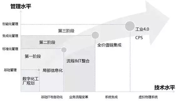 管理水平从基础管理、标准化管理一直到集成化管理、智能化管理。技术水平从基础IT与自动化,到业务流程变革,再到系统集成,最后实现CPS。企业可以根据自身所处的阶段,重点关注本阶段需要重点去推进的事情,做到2.0补课,3.0普及,4.0目标。