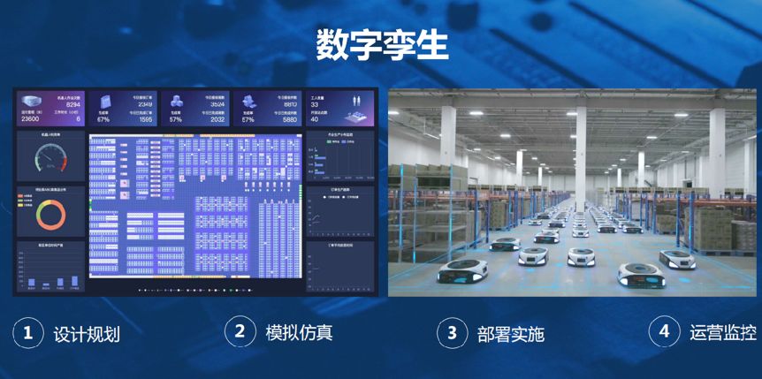 数字孪生是指实现虚拟世界与真实世界的一致化,尽可能逼真地仿真模拟,包括对于机器人的模拟、设备的模拟、订单的模拟、对于人的模拟、对于异常事件的模拟,从而实现线上的仿真规划,逼近真实执行系统的效率。