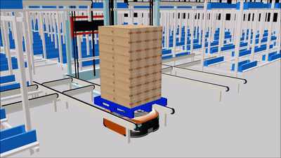 在货物下方穿梭行驶,在轨道交叉路口实现原地换轨,将货物从放货巷道,换轨至主干道,搬运货物到指定配送工位。从仓库到工位,无需二次搬运。
