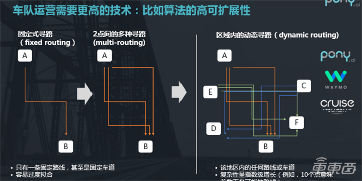 而出行服务要求任意两点之间以任意多种方式行驶,即区域内的动态寻路(dynamic routing),具体行驶路径需要无人车自己去规划,过程中还需要考虑封路、拥堵、用户位置变动等不可预知的情况,复杂性呈指数级增长,这对整个系统能力又有了更高的要求。