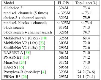 搜索卷积层的通道数非常有挑战,如图 4 所示,本文提出一个全新的选择单元用于通道数搜索,并首先在基线结构 “all choice 3”(见表 3)做了评估,结果如表 4 (第一部分)所示;为进一步提升精度,本文对构造单元和通道做了联合搜索。结果如表 4(第二部分)所示。