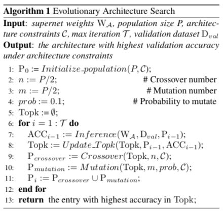 针对等式 (6) 中的模型搜索,先前的One-shot工作使用随机搜索。这在大的搜索空间中并不奏效。因此,本文使用了进化算法,同时扬弃了从头开始训练每个子结构的缺点,只涉及推理部分,因此非常高效。详见下图。