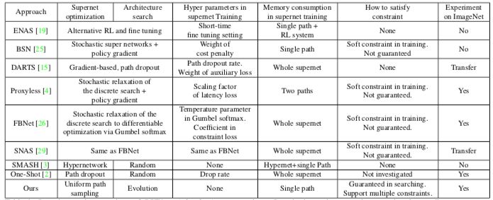 单路径超网络、均匀采样训练策略、基于进化算法的模型搜索、丰富的搜索空间设计,上述多种设计使得本文方法简单、高效和灵活。下表给出了本文方法与其他权重共享方法的一个全方位、多维度对比结果。