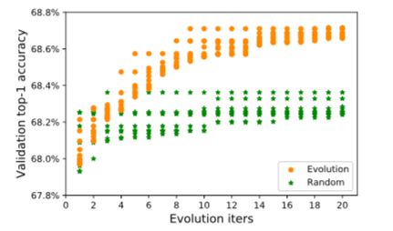 下图描绘了使用进化算法和随机搜索两种方法在进化迭代时的验证集精度。很明显进化算法搜索更有效。