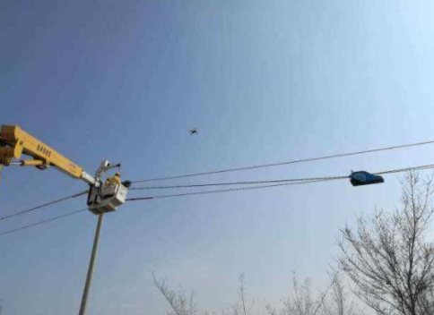 电力人员悬挂机器人,准备开始作业。