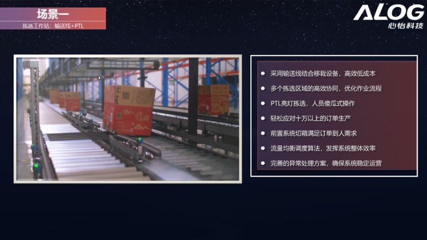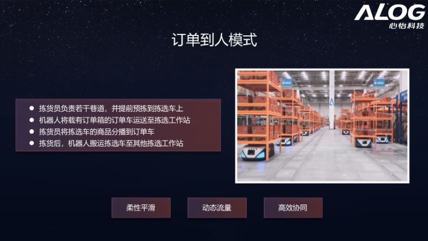 心怡科技是国内AGV应用比较早的,一开始是和极智嘉合作,2014年还是/2015年的时候就开始做,我们针对A类商品,就是畅销类的商品。这种模式的特征是什么呢?机器人驮着拣货车,人在巷道上进行拣选。AGV驮着订单车到巷道口的时候,我们进行分拨,这是订单到人的模式。他的特征其实就是用AGV代替人的搬运操作。所以如果AGV忙不过来,都可以人工进行拣选,这是柔性自动化很好的应用。我们可以通过系统的分流,把货分出去,可以快速调整热点区域的分布,实现动态流量的调度。甚至我可以通过后台的调动数据,使某个地方的AGV多一些、少一些。