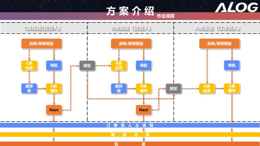 自动化之后,是不是就全部没人工了呢?不是的。所以我们要解决的就是,有一部分是人工作业,有一部分是用自动化作业,这种子母仓作业场景。我们可以预测到哪个商品和哪个商品一起卖的机率比较大,我们把这些商品放到一个货架上面,就可以减少AGV的调用次数,从而提高AGV的使用效率。所以看起来很简单,但其实里面蕴藏着很多业务和系统的逻辑。