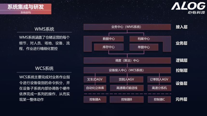 系统联系着整个设备和流程,系统也是分层的:上边可能会去接业务的ERP、OMS等等,进行数据接入:我们自己会有统一的数据、档案,以及库存、单据这,这是作为业务中间层的这块:在业务中间层下面,会有一个逻辑层,主要是用来调度各种设备的,这层叫做WCS,这块也是心怡科技的强项。我们通过与设备厂商深入沟通,能够充分的挖掘每个设备的特性,然后介入我们的业务,通过介入我们的业务,能够把设备的能力做到最优。