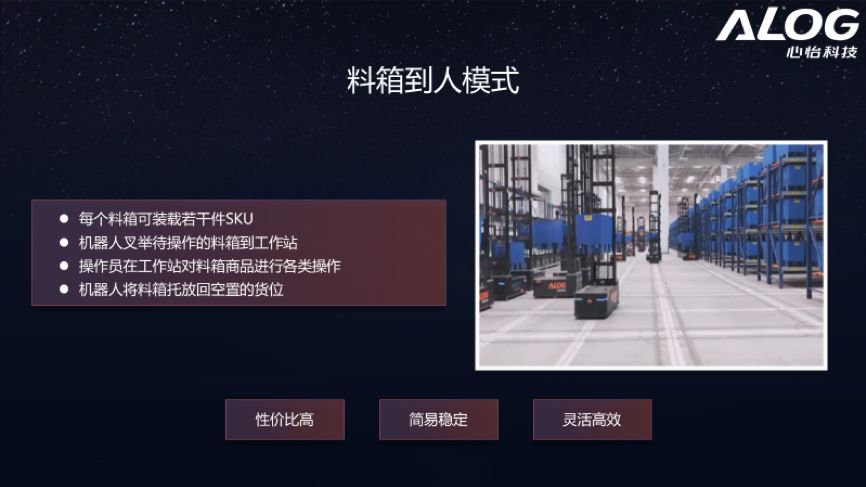 适用的是C类商品,对于C类商品,如果采用货架到人的话,我们评估下来,效率达不到我们的要求的。采用料箱到人,能够解决这个问题。一个料箱可以放多个SKU,通过若干台AGV,把料箱驮到工作站,可以保证料箱送到工作站是连贯的,人可以不停的作业。还有一个好处,节省投资,利用现有的货架稍做改造就可以。