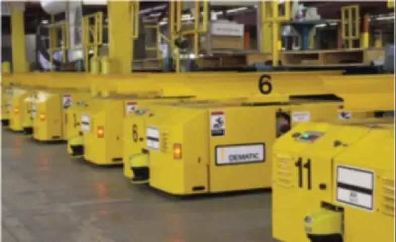 28台德马泰克自动导引小车(AGV),采用RF通信和获得专利的导引系统,含有更新的标记磁铁,无需地面布线,可轻松更改导引路径,并将货箱送达指定地点。