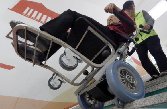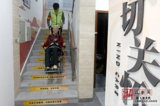 4月16日,在杭州白塔岭社区“护佰岁养老服务中心”,俞信花阿姨在志愿者的帮助下,坐上刚投入使用的微型轮椅爬楼机器人上楼梯。俞阿姨说:“这感觉就像坐上了越野车上楼。” 作为浙江省无障碍社区试点项目而引进的这台德国原装全自动爬楼机,采用“智能—踏步”2.0专利技术和锂电驱动,体量小巧,折叠轻便,使用时只需一名成年人把扶着方向,就可轻松地操作爬楼机平稳地上下楼梯。辖区行动不便的残疾人和老人只需拨打电话预约,就可得到上门服务。