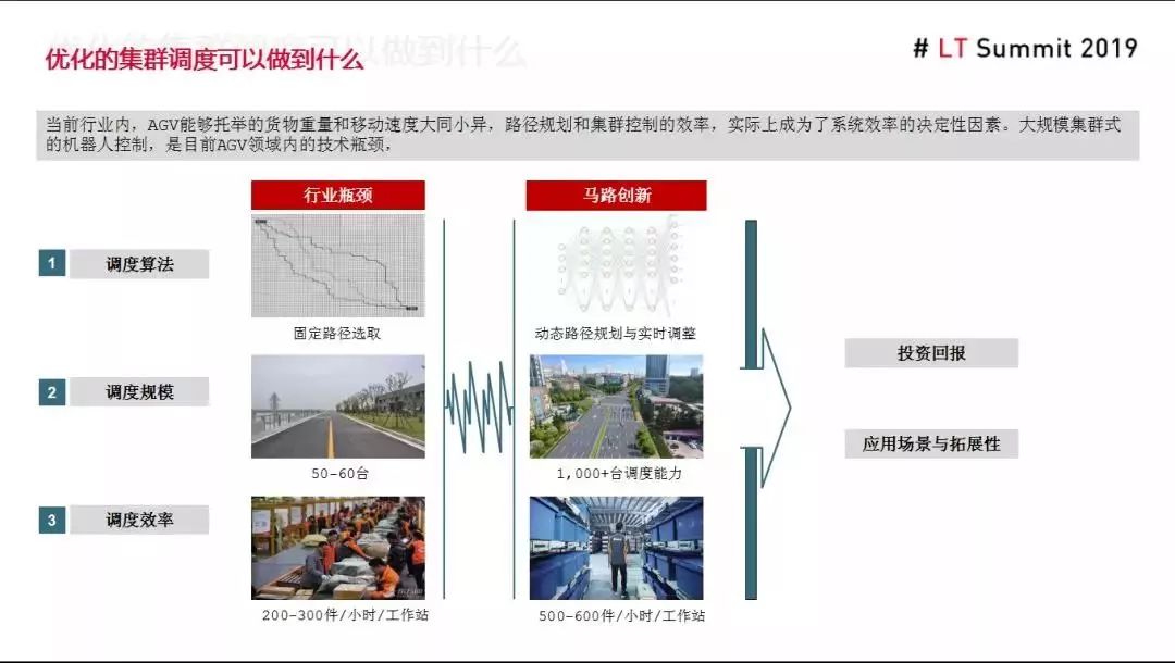 真正影响最大的点在于原来客户拆零分拣的时候人效是100,你实施了改变以后能实现500还是600,这个提升对他的投资回报是有显著影响的。其实这样一些软件调度的算法,才真正影响到客户对机器人的应用。同时我们也认为只有真正能做到比较好的集群协作以后,一些跨行业、跨场景的协同才成为可能。