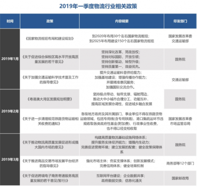 点评:从一季度政策来看,我国物流发展的重点方向包括四大方面,其一,是进一步完善物流网络布局,提升物流节点枢纽能力;其二,是进一步提升国际物流服务能力,提高保税区及跨境物流发展水平;其三,是继续加强物流信息化建设,持续鼓励物流数据共享;其四,是标准化建设继续推进,物流行业规范化水平持续提升。