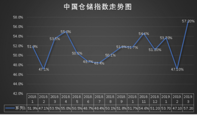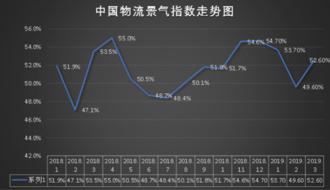 2019年中国物流业景气指数1月份为53.7%,2月份为49.6%,3月份为52.6%;2019年中国仓储指数1月为53.7%,2月为47.1%,3月为57.2%。