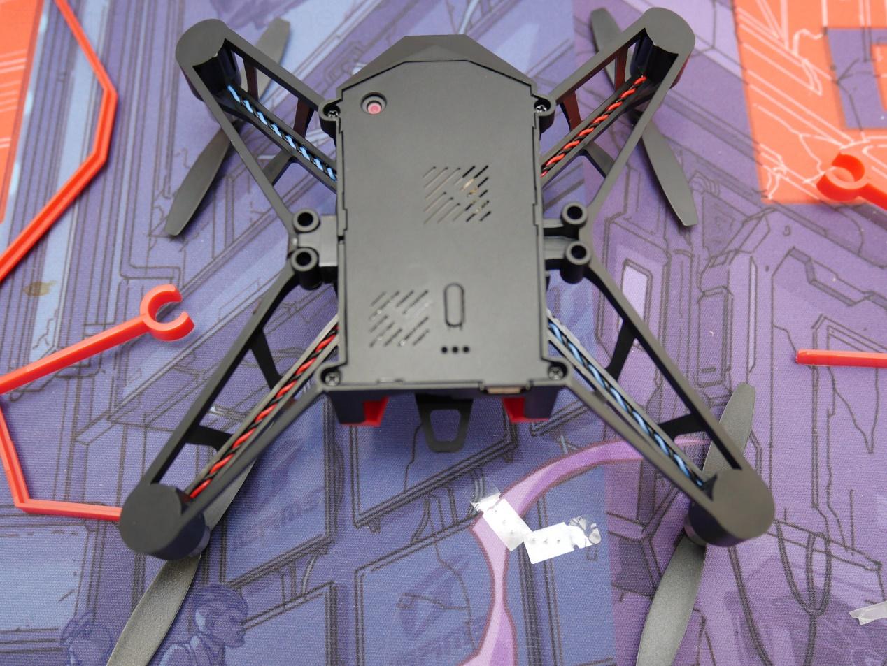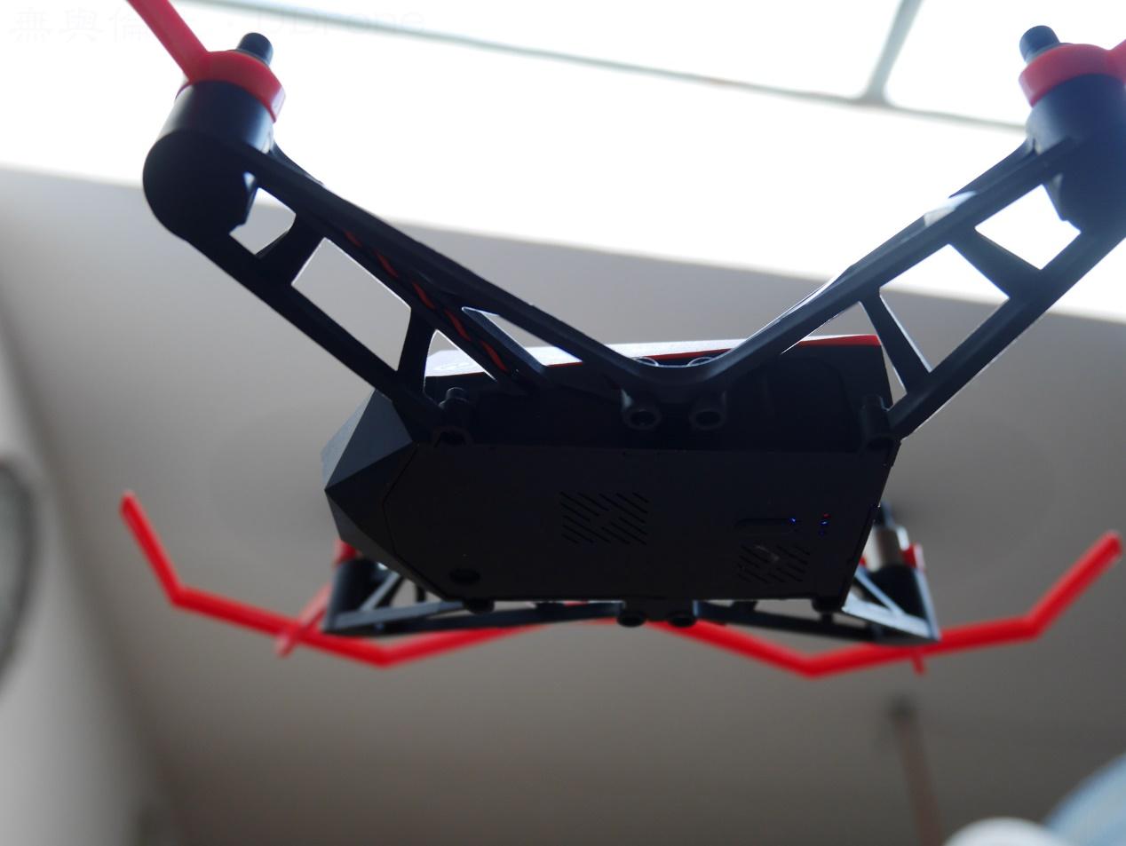 在无人机的底部,主要是有一处用于检测高度的传感器,此外还有开关。在使用时,起飞后的UDrone会自动悬停在1.2米的高度,如果是在飞行中,则可以在过于贴近水平面的时候自动闪避或拉升,保障飞行器的安全。