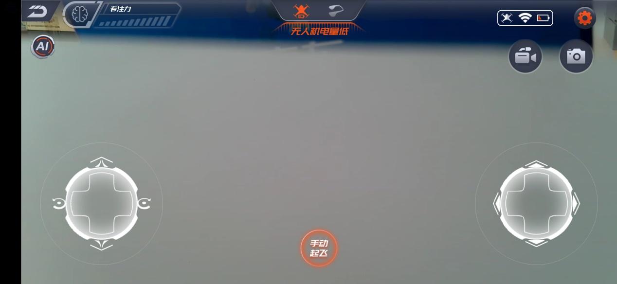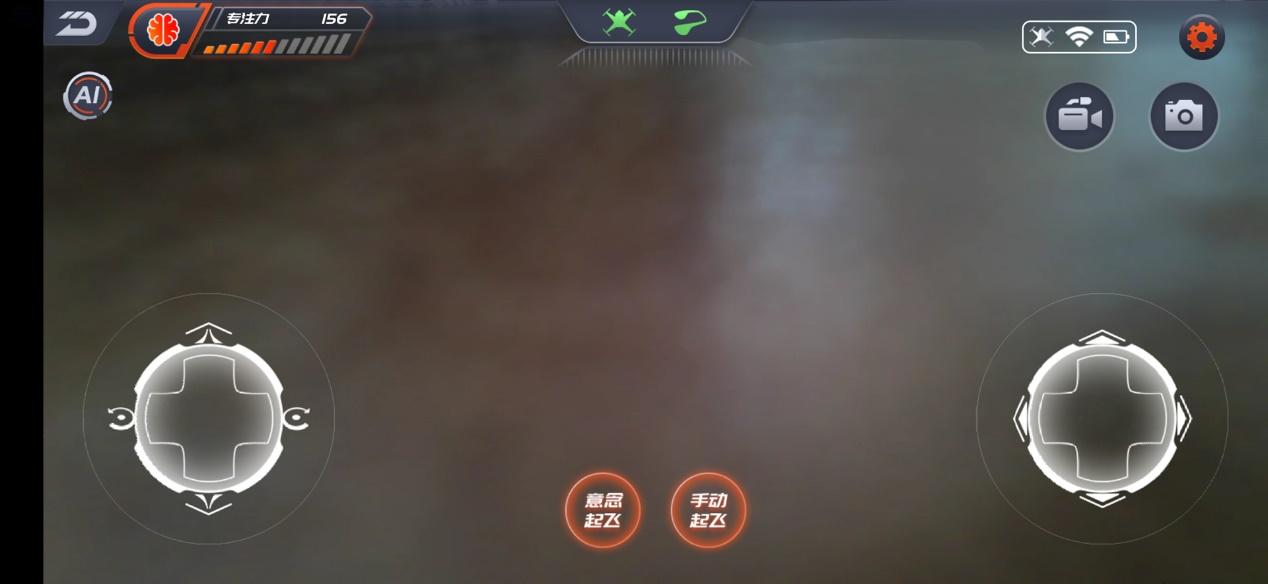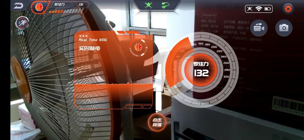 操作界面的背景是无人机摄像头的实时画面,左右侧下方,有着轮盘式的控制键,分别用来操作无人机的位置状态和飞行方向,右上方可以看到无人机的联网和电池状况,还有录像和拍照按键,连接控制器后,可以在左上角看到专注力,起飞方式可以通过意念和手动两种方式完成。整个界面比较清晰易懂,通常简单操作一下就能够明白,对于新手来说非常友好。