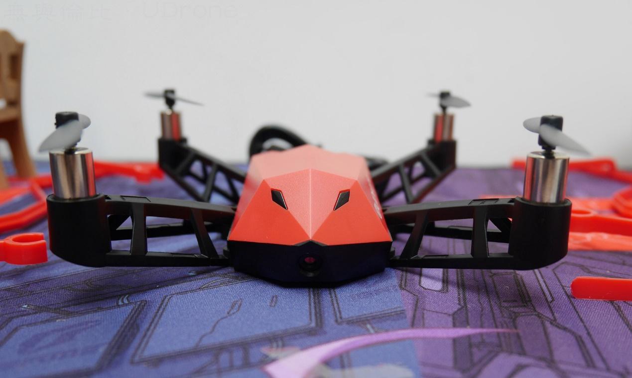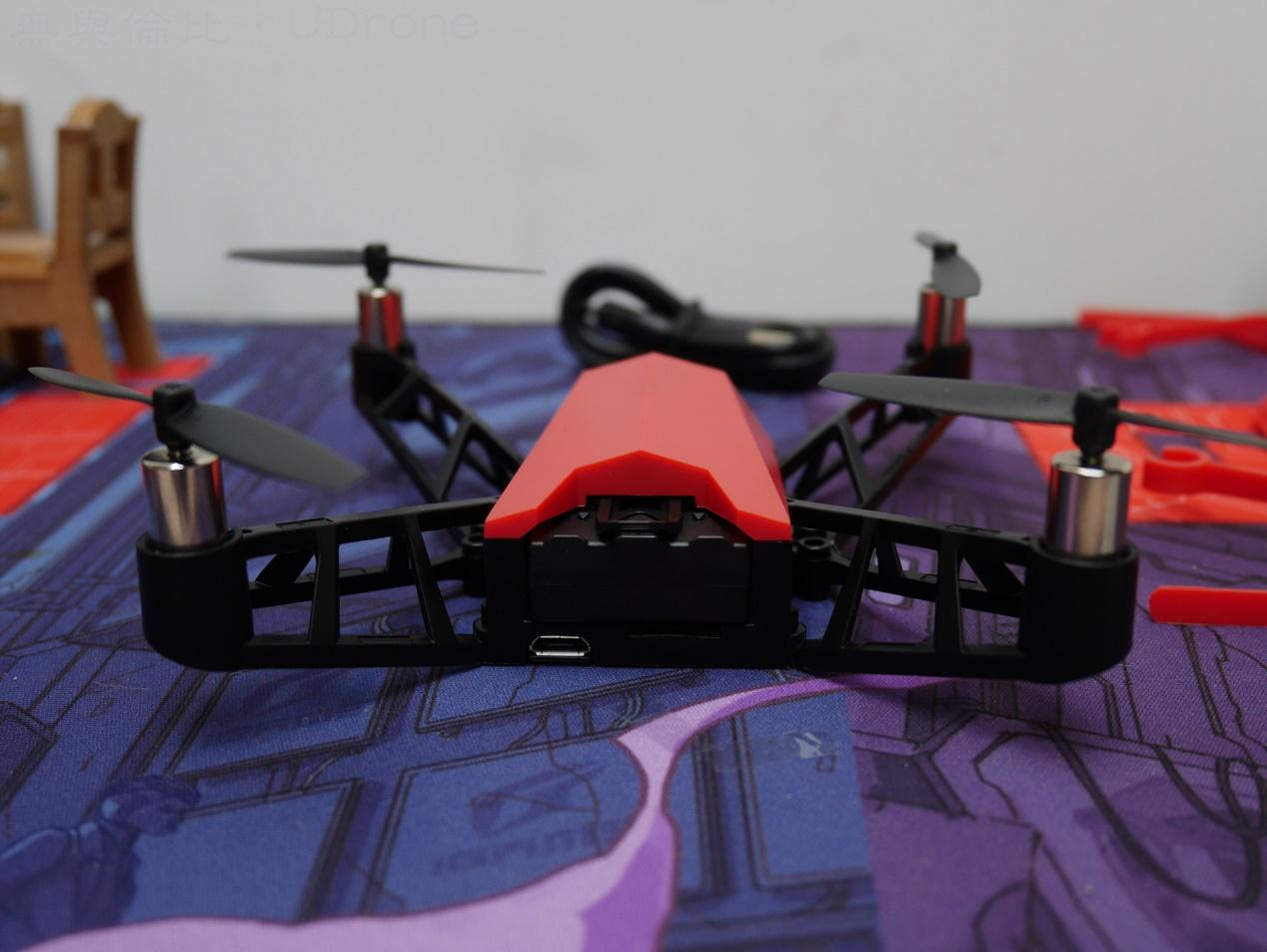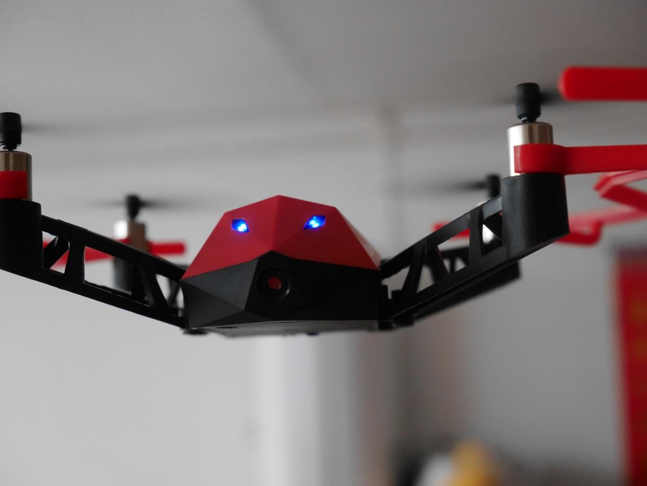 UDrone无人机本身是已经组装好的,只需要装上防撞保护罩和电池后就可以使用了。其造型设计比较漂亮,特别是前端的两个LED眼睛装饰,在工作过程中会变成蓝色,非常的漂亮。