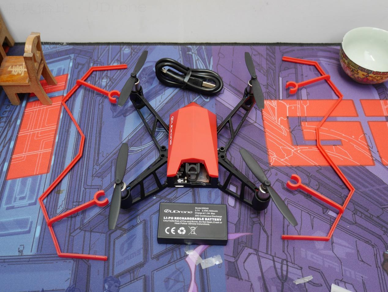 这款UDrone无人机的红色包装盒简约而漂亮,同时无人机本身也采用了红黑配色,因此在飞行的时候比常见的黑色无人机更加的显眼。飞行器和控制器都是独立包装的,并且有海绵填充,所以对于脆弱的螺旋桨和传感器等配件,都可以在运输中获得很好的保护。