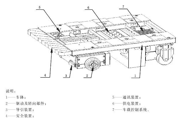 又据GB/T 30029-2013《自动导引车(AGV)设计通则》,自动导引车的组成主要包括车体、驱动及转向部件、导引装置、安装装置、供电装置、车载控制系统、通讯装置,其按移载方式可分为搬运型自动导引车(transfering AGV)、装配型自动导引车(assembling AGV)及牵引式自动导引车(towing AGV)。