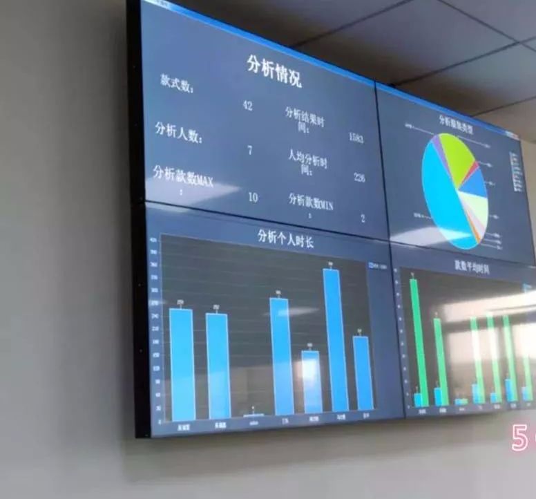 在这块屏幕上可以看到整个IE部每周分析款式的情况以及分析的结果对比。如图示,本周一共有7个人参与分析,分析的款式为40多件,总分析时长为1700多分钟,平均每个人的分析时长为250-290之间。