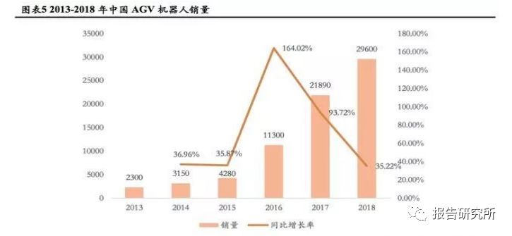2013年至2018年,中国AGV机器人销量从最初的2439台增长至2018年的18000台(估计值),产业发展速度极快。
