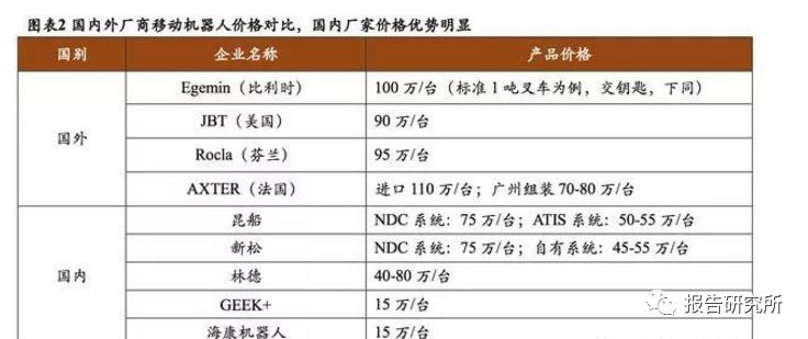 国产机器人具有一定的性价比。国外的AGV产品价格普遍在80-100万/台,而国内的AGV产品价格普遍在40-70万元/台,比国外低50%左右。