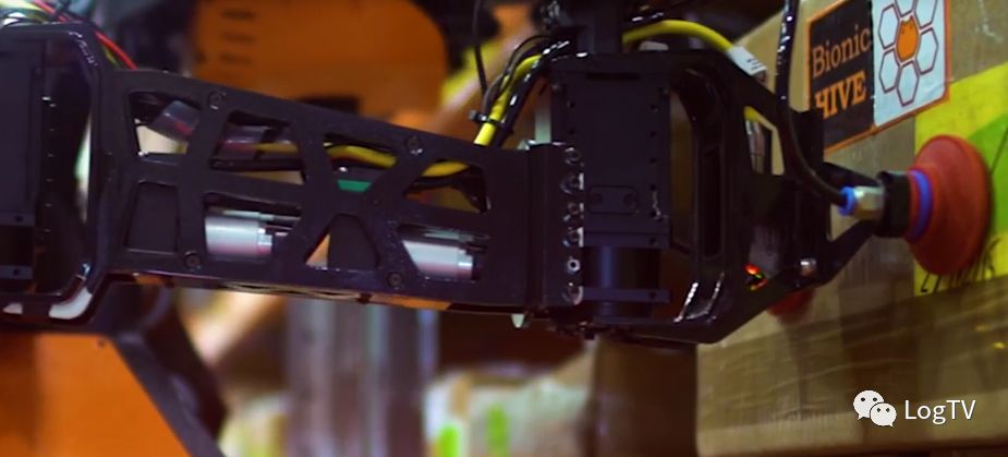 机器人配备有小型机械臂,机械臂依靠吸盘吸取货物。机械人接收订单,攀爬至货架,用机械臂上的吸盘直接将货物平移到机器人的载货平台上,然后返回地面。
