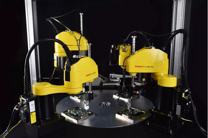 四台SCARA SR-3iA机器人按工序完成电路板的点胶、螺钉锁紧、检测及贴标、螺钉拆除作业