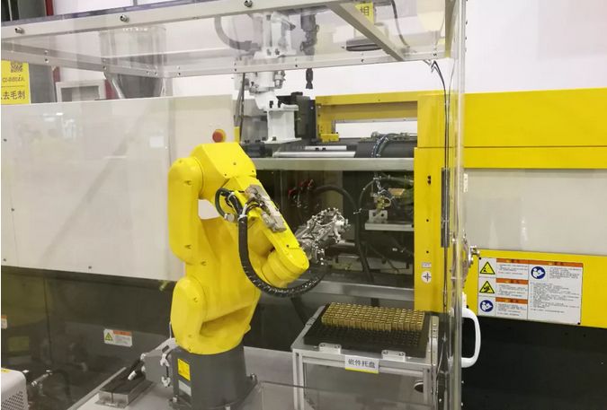 LR Mate 200iD机器人配合α-S50iA注塑机完成汽车零件的嵌件注塑、取出和去毛刺自动化作业